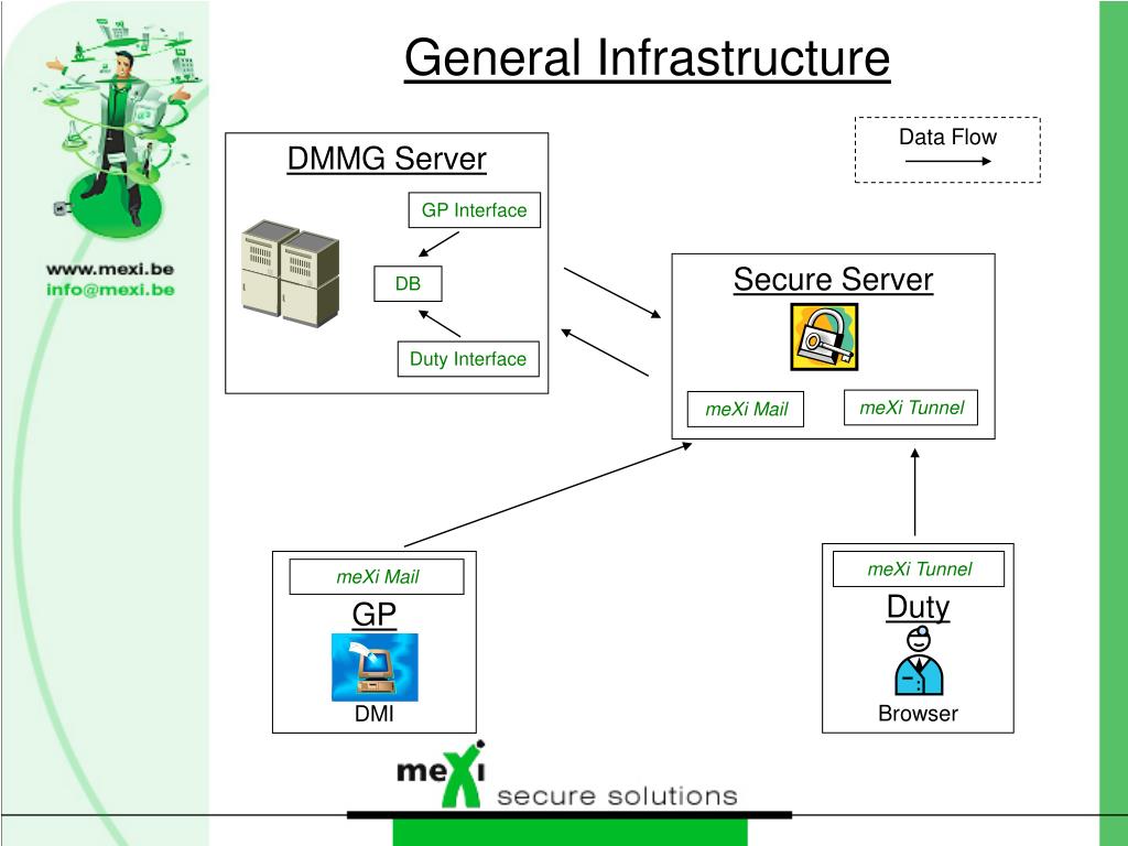 Data Flow DMMG Server GP Interface General Infrastructure Secure Server DB Duty Interface meXi Tunnel meXi Mail Duty Browser GP DMI meXi Tunnel meXi Mail