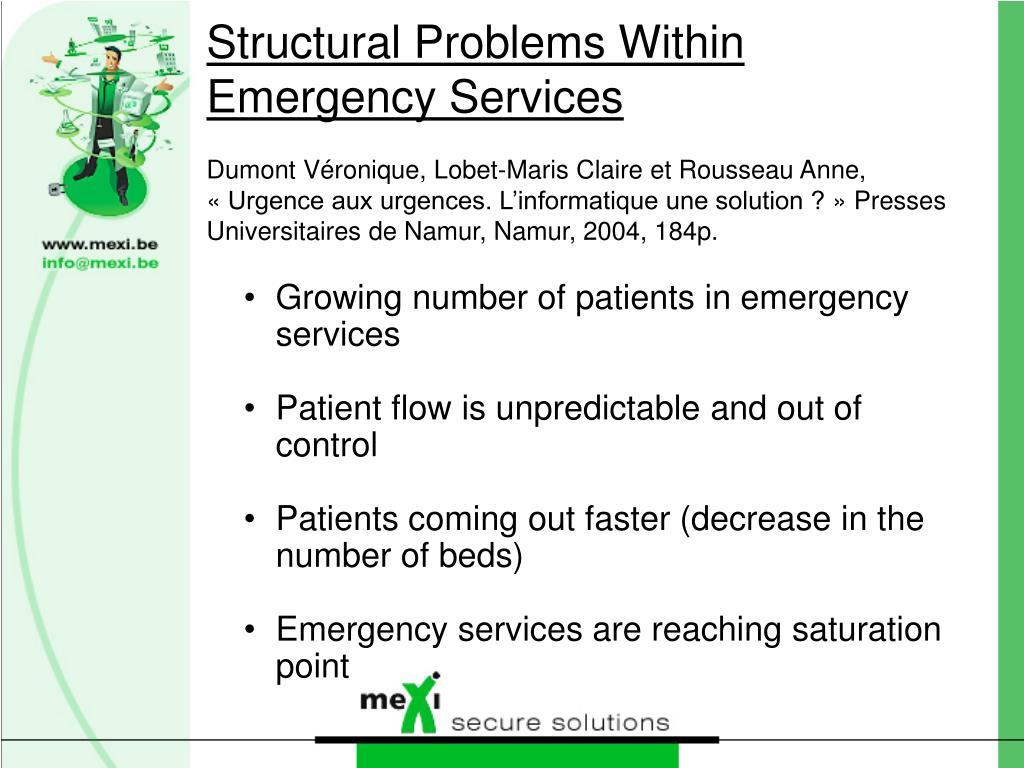 Structural Problems Within Emergency ServicesDumont Véronique, Lobet-Maris Claire et Rousseau Anne, « Urgence aux urgences. L’informatique une solution ? » Presses Universitaires de Namur, Namur, 2004, 184p. • Growing number of patients in emergency services • Patient flow is unpredictable and out of control • Patients coming out faster (decrease in the number of beds) • Emergency services are reaching saturation point