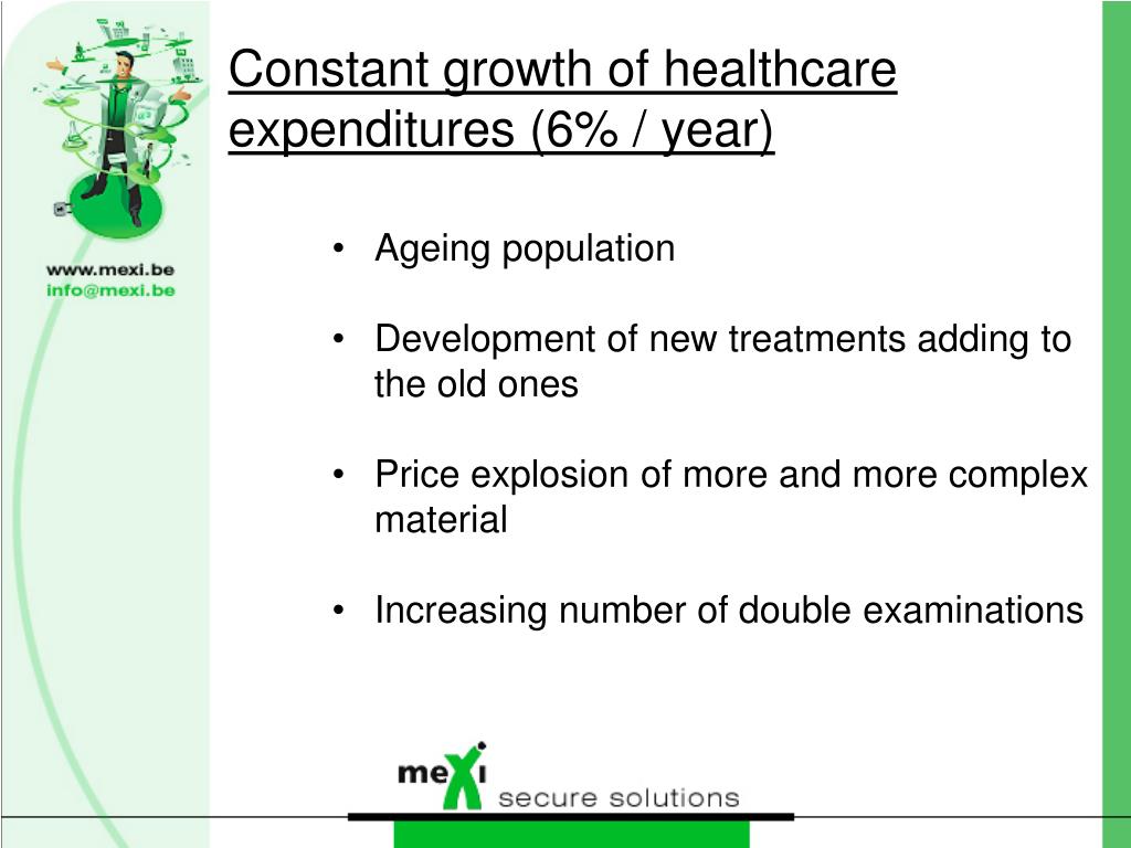 Constant growth of healthcare expenditures (6% / year) • Ageing population • Development of new treatments adding to the old ones • Price explosion of more and more complex material • Increasing number of double examinations