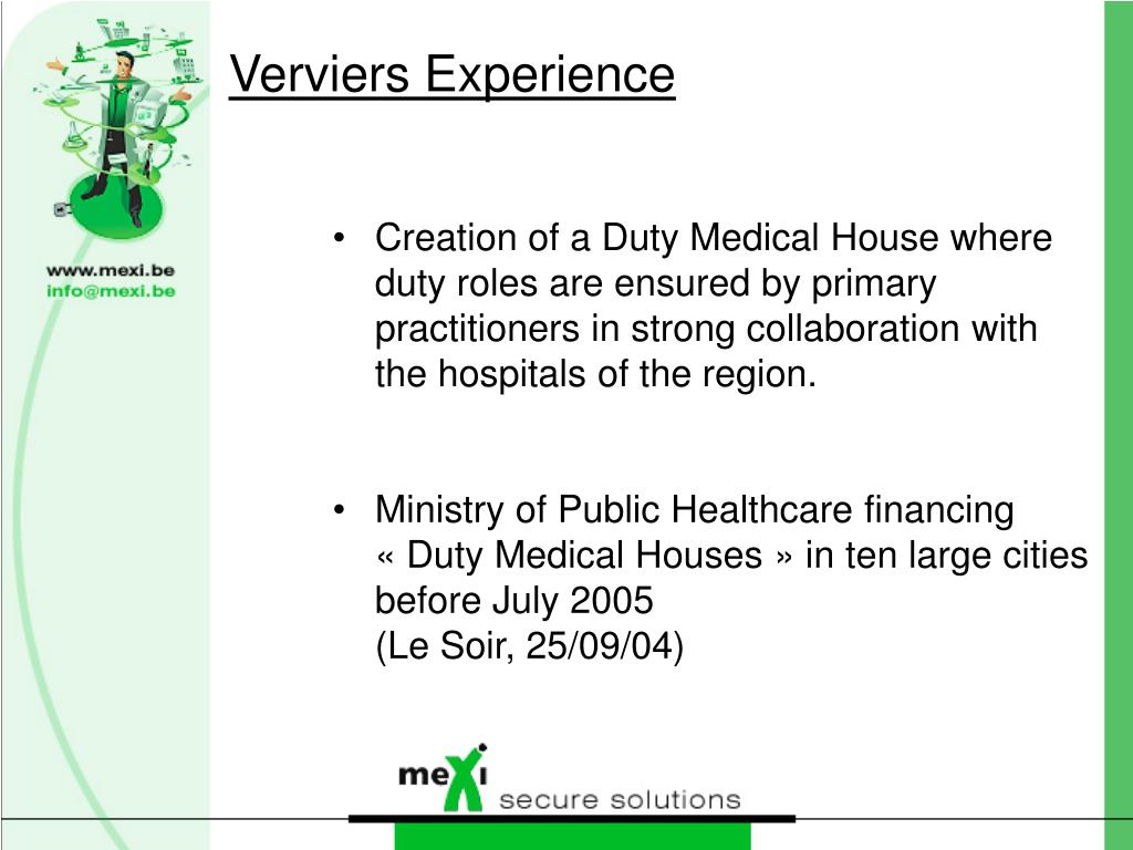 Verviers Experience • Creation of a Duty Medical House where duty roles are ensured by primary practitioners in strong collaboration with the hospitals of the region. • Ministry of Public Healthcare financing « Duty Medical Houses » in ten large cities before July 2005 (Le Soir, 25/09/04)