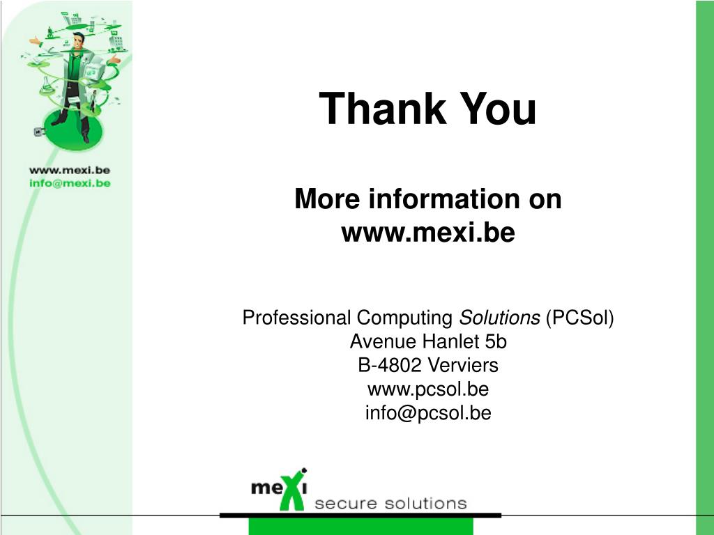 Thank YouMore information onwww.mexi.beProfessional Computing Solutions (PCSol)Avenue Hanlet 5bB-4802 Vervierswww.pcsol.beinfo@pcsol.be