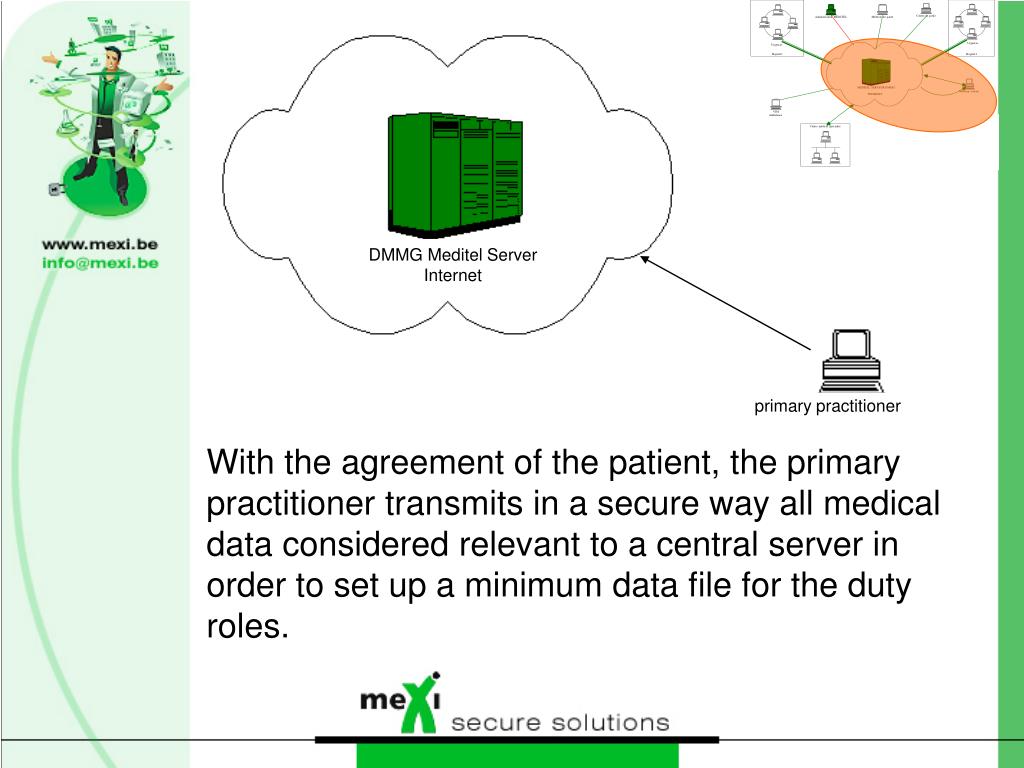 DMMG Meditel Server Internet primary practitioner With the agreement of the patient, the primary practitioner transmits in a secure way all medical data considered relevant to a central server in order to set up a minimum data file for the duty roles.