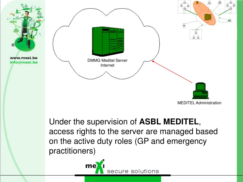 DMMG Meditel Server Internet MEDITEL Administration Under the supervision of ASBL MEDITEL, access rights to the server are managed based on the active duty roles (GP and emergency practitioners)