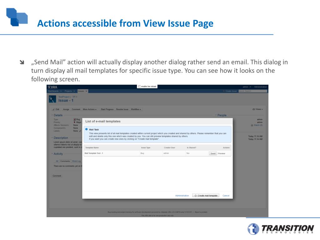 Actions accessible from View Issue Page • „Send Mail” actionwillactually display another dialog rathersendan email. This dialog in turn display all mail templates for specificissuetype. Youcanseehowitlooks on the followingscreen.