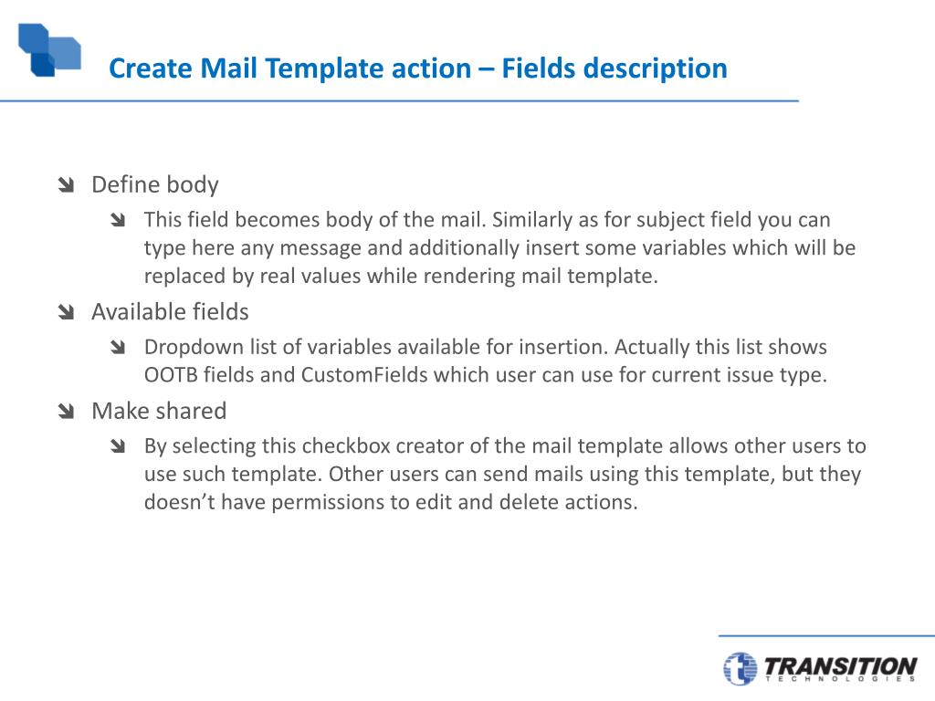 Create Mail Templateaction – Fields description • Definebody • This field becomes body of the mail. Similarly as for subject field youcantypehereanymessage and additionally insert somevariableswhichwill be replaced by real valueswhile rendering mail template. • Availablefields • Dropdown list of variablesavailable for insertion. Actuallythis list shows OOTB fields and CustomFieldswhichusercanuse for currentissuetype. • Makeshared • By selectingthischeckboxcreator of the mail templateallowsotherusers to usesuchtemplate. Otheruserscansendmailsusingthistemplate, but theydoesn’thavepermissions to editand deleteactions.