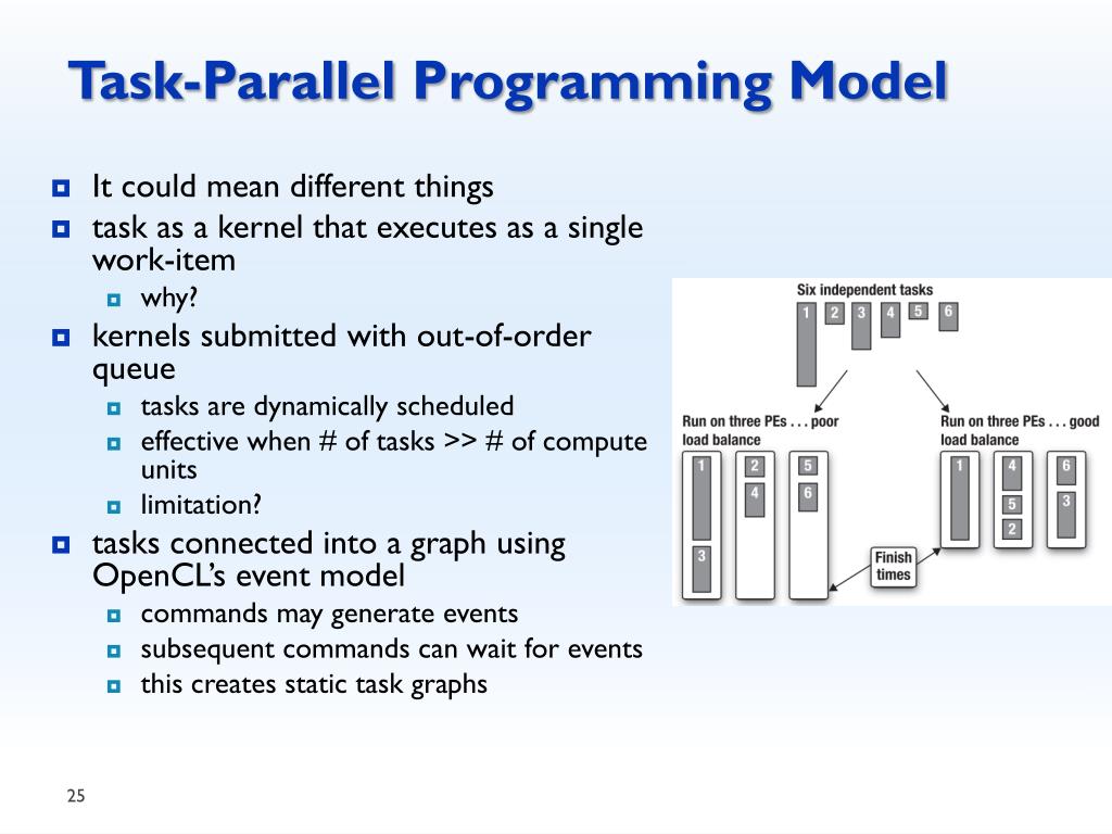 Task-Parallel Programming Model • It could mean different things • task as a kernel that executes as a single work-item • why? • kernels submitted with out-of-order queue • tasks are dynamically scheduled • effective when # of tasks >> # of compute units • limitation? • tasks connected into a graph using OpenCL’s event model • commands may generate events • subsequent commands can wait for events • this creates static task graphs