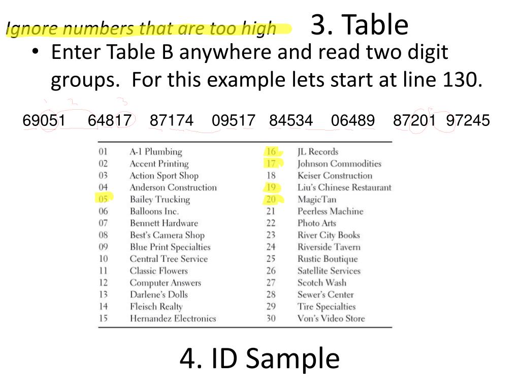 Ignore numbers that are too high 3. Table • Enter Table B anywhere and read two digit groups. For this example lets start at line 130. 69051 64817 87174 09517 84534 06489 87201 97245 4. ID Sample