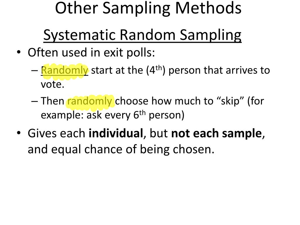 Other Sampling Methods Systematic Random Sampling • Often used in exit polls: • Randomly start at the (4th) person that arrives to vote. • Then randomly choose how much to “skip” (for example: ask every 6th person) • Gives each individual, but not each sample, and equal chance of being chosen.