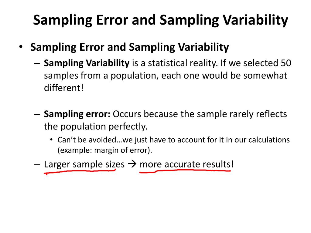 Sampling Error and Sampling Variability • Sampling Error and Sampling Variability • Sampling Variability is a statistical reality. If we selected 50 samples from a population, each one would be somewhat different! • Sampling error: Occurs because the sample rarely reflects the population perfectly. • Can’t be avoided…we just have to account for it in our calculations (example: margin of error). • Larger sample sizes more accurate results!