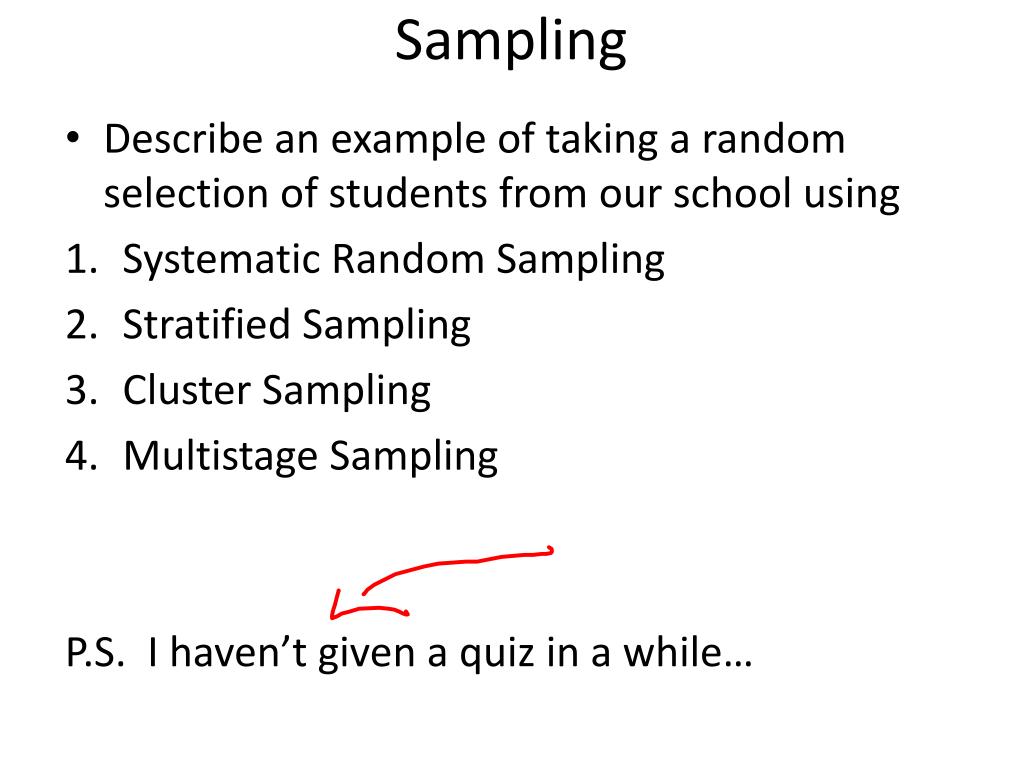 Sampling • Describe an example of taking a random selection of students from our school using • Systematic Random Sampling • Stratified Sampling • Cluster Sampling • Multistage Sampling P.S. I haven’t given a quiz in a while…