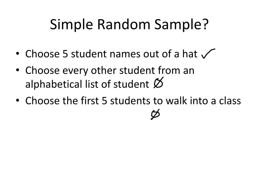 Simple Random Sample? • Choose 5 student names out of a hat • Choose every other student from an alphabetical list of student • Choose the first 5 students to walk into a class