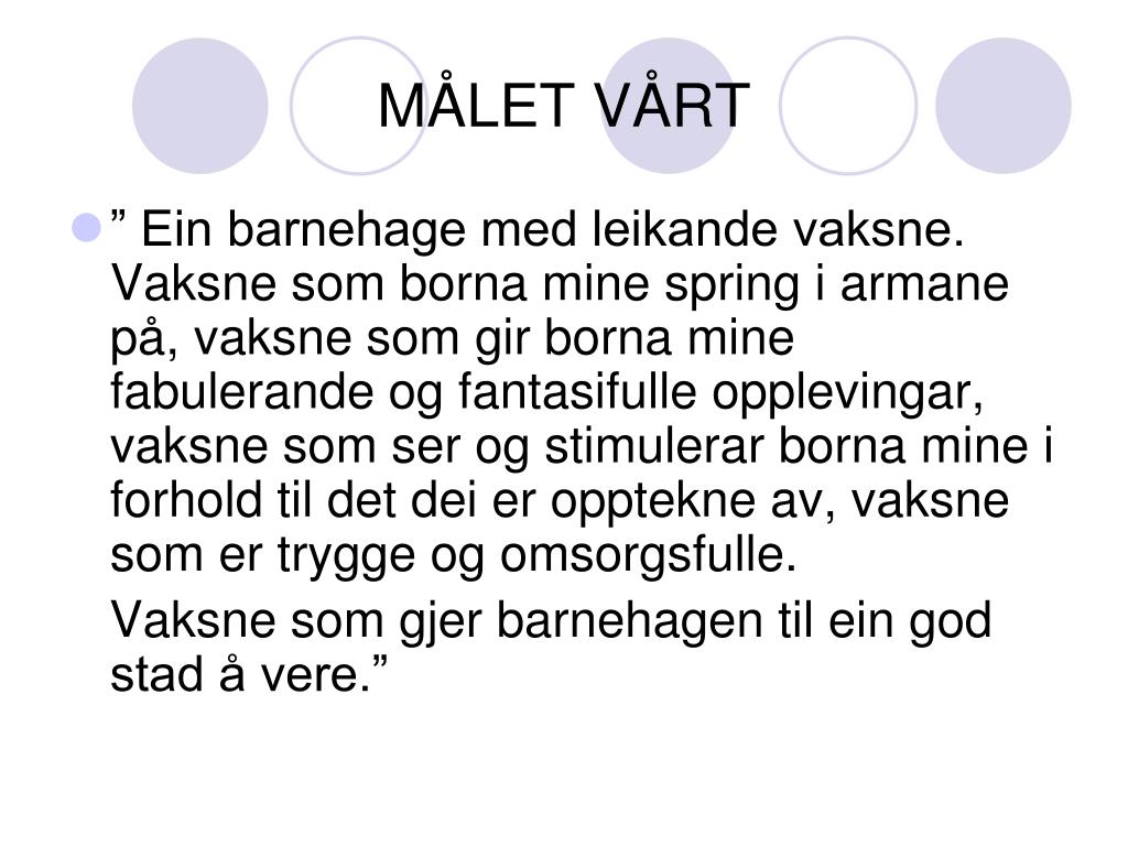 MÅLET VÅRT • ” Ein barnehage med leikande vaksne. Vaksne som borna mine spring i armane på, vaksne som gir borna mine fabulerande og fantasifulle opplevingar, vaksne som ser og stimulerar borna mine i forhold til det dei er opptekne av, vaksne som er trygge og omsorgsfulle. Vaksne som gjer barnehagen til ein god stad å vere.”