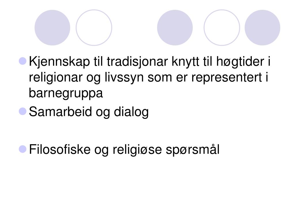 Kjennskap til tradisjonar knytt til høgtider i religionar og livssyn som er representert i barnegruppa • Samarbeid og dialog • Filosofiske og religiøse spørsmål
