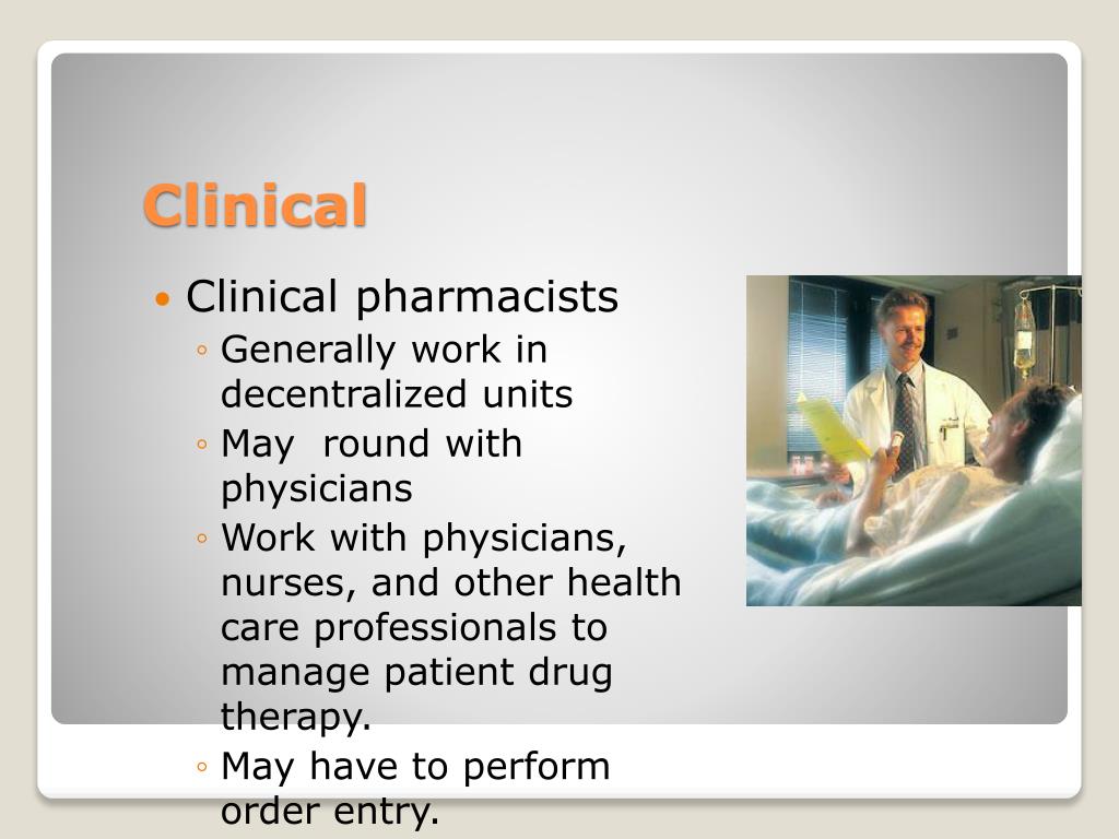 Clinical • Clinical pharmacists • Generally work in decentralized units • May round with physicians • Work with physicians, nurses, and other health care professionals to manage patient drug therapy. • May have to perform order entry.