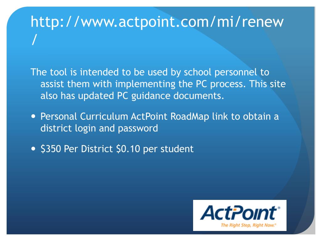 http://www.actpoint.com/mi/renew/ The tool is intended to be used by school personnel to assist them with implementing the PC process. This site also has updated PC guidance documents. • Personal Curriculum ActPoint RoadMap link to obtain a district login and password • $350 Per District $0.10 per student