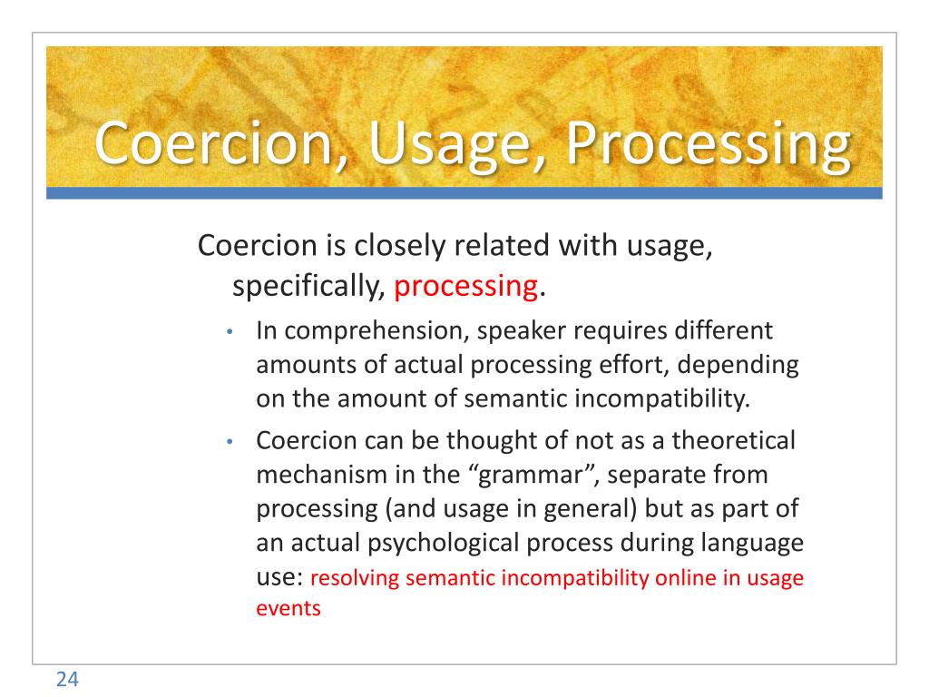 Coercion, Usage, Processing Coercion is closely related with usage, specifically, processing. • In comprehension, speaker requires different amounts of actual processing effort, depending on the amount of semantic incompatibility. • Coercion can be thought of not as a theoretical mechanism in the “grammar”, separate from processing (and usage in general) but as part of an actual psychological process during language use: resolving semantic incompatibility online in usage events