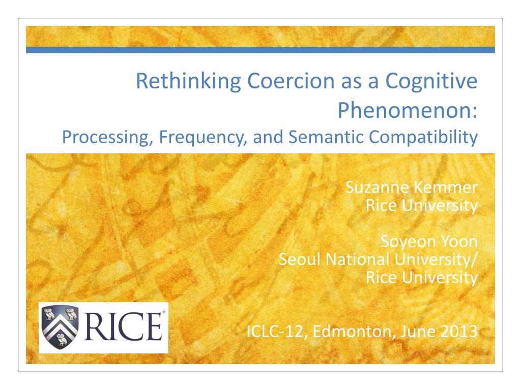 Rethinking Coercion as a Cognitive Phenomenon: Processing, Frequency, and Semantic Compatibility. Suzanne Kemmer Rice University Soyeon Yoon Seoul National University/ Rice University ICLC-12, Edmonton, June 2013. Coercion.