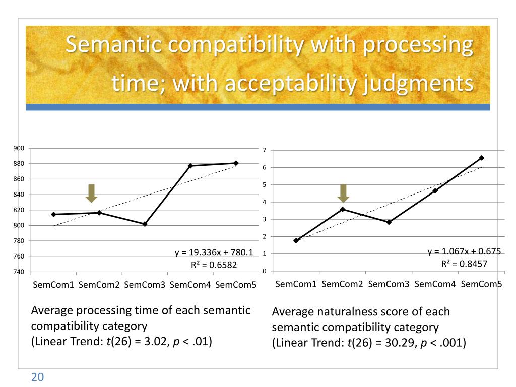 Semantic compatibility with processing time; with acceptability judgments • Average processing time of each semantic compatibility category • (Linear Trend: t(26) = 3.02, p < .01) • Average naturalness score of each semantic compatibility category • (Linear Trend: t(26) = 30.29, p < .001) Figure 1. Average processing time of each semantic compatibility category • (Linear Trend: t(26) = 30.29, p < .001)
