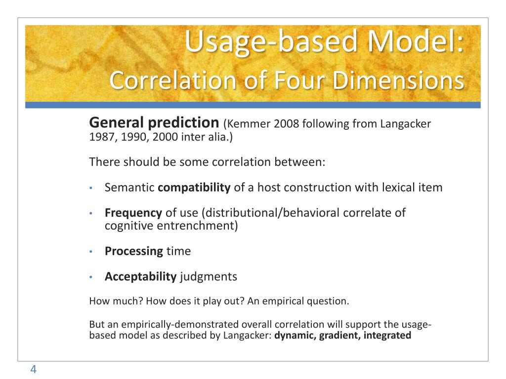 Usage-based Model: Correlation of Four Dimensions General prediction (Kemmer 2008 following from Langacker 1987, 1990, 2000 inter alia.) There should be some correlation between: • Semantic compatibility of a host construction with lexical item • Frequency of use (distributional/behavioral correlate of cognitive entrenchment) • Processing time • Acceptabilityjudgments How much? How does it play out? An empirical question. But an empirically-demonstrated overall correlation will support the usage-based model as described by Langacker: dynamic, gradient, integrated