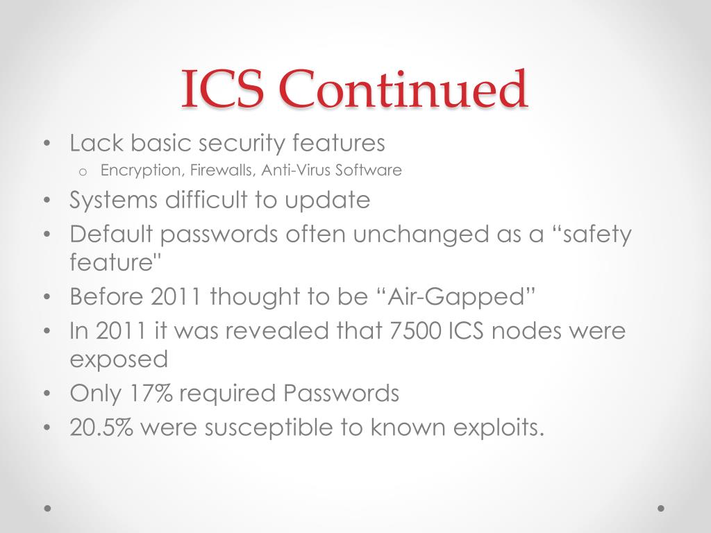 ICS Continued • Lack basic security features • Encryption, Firewalls, Anti-Virus Software • Systems difficult to update • Default passwords often unchanged as a “safety feature" • Before 2011 thought to be “Air-Gapped” • In 2011 it was revealed that 7500 ICS nodes were exposed • Only 17% required Passwords • 20.5% were susceptible to known exploits.