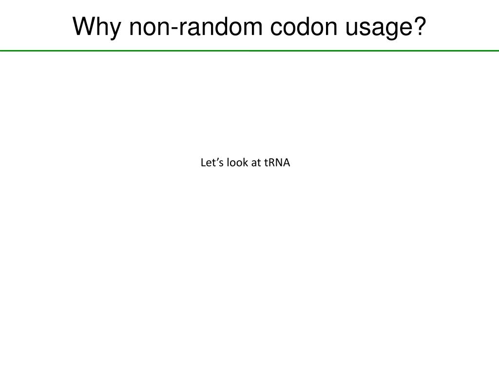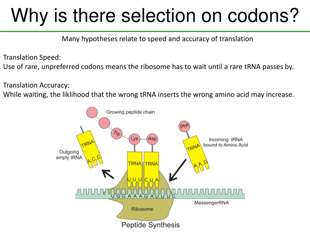 Why is there selection on codons? Many hypotheses relate to speed and accuracy of translation Translation Speed: Use of rare, unpreferredcodons means the ribosome has to wait until a rare tRNA passes by. Translation Accuracy: While waiting, the liklihood that the wrong tRNA inserts the wrong amino acid may increase.