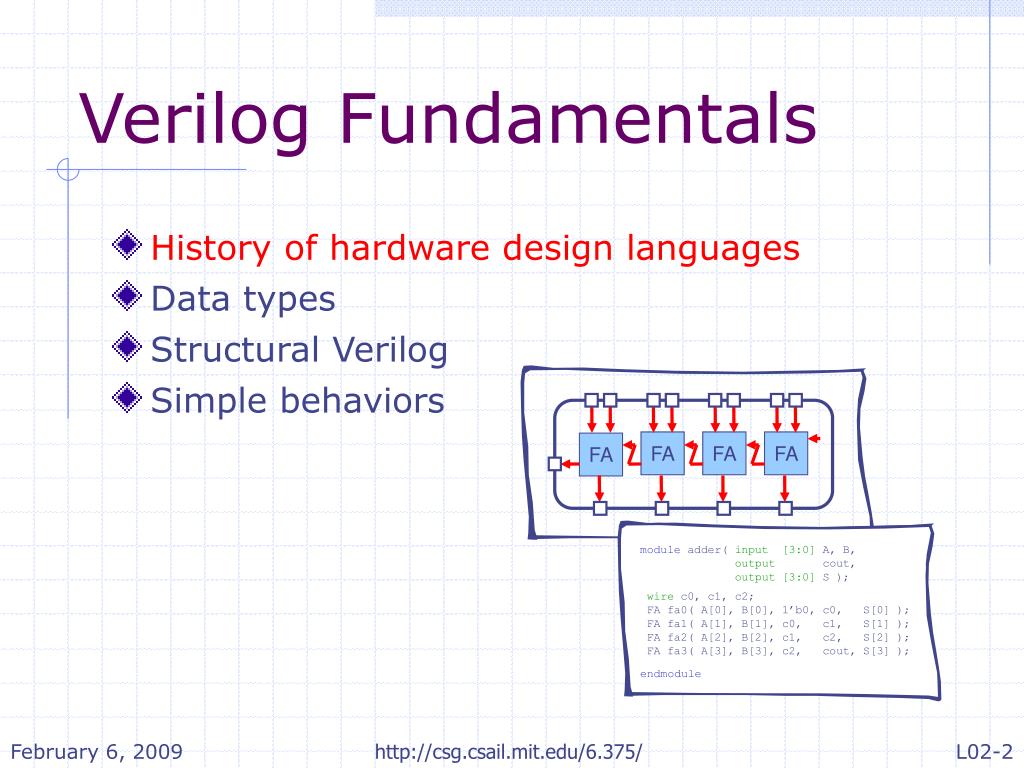FA FA FA FA module adder( input [3:0] A, B, output cout, output [3:0] S ); wire c0, c1, c2; FA fa0( A[0], B[0], 1’b0, c0, S[0] ); FA fa1( A[1], B[1], c0, c1, S[1] ); FA fa2( A[2], B[2], c1, c2, S[2] ); FA fa3( A[3], B[3], c2, cout, S[3] ); endmodule Verilog Fundamentals • History of hardware design languages • Data types • Structural Verilog • Simple behaviors http://csg.csail.mit.edu/6.375/