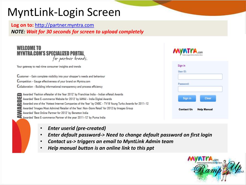 MyntLink-Login Screen Log on to: http://partner.myntra.com NOTE: Wait for 30 seconds for screen to upload completely • Enter userid (pre-created) • Enter default password-> Need to change default password on first login • Contact us-> triggers an email to MyntLink Admin team • Help manual button is an online link to this ppt