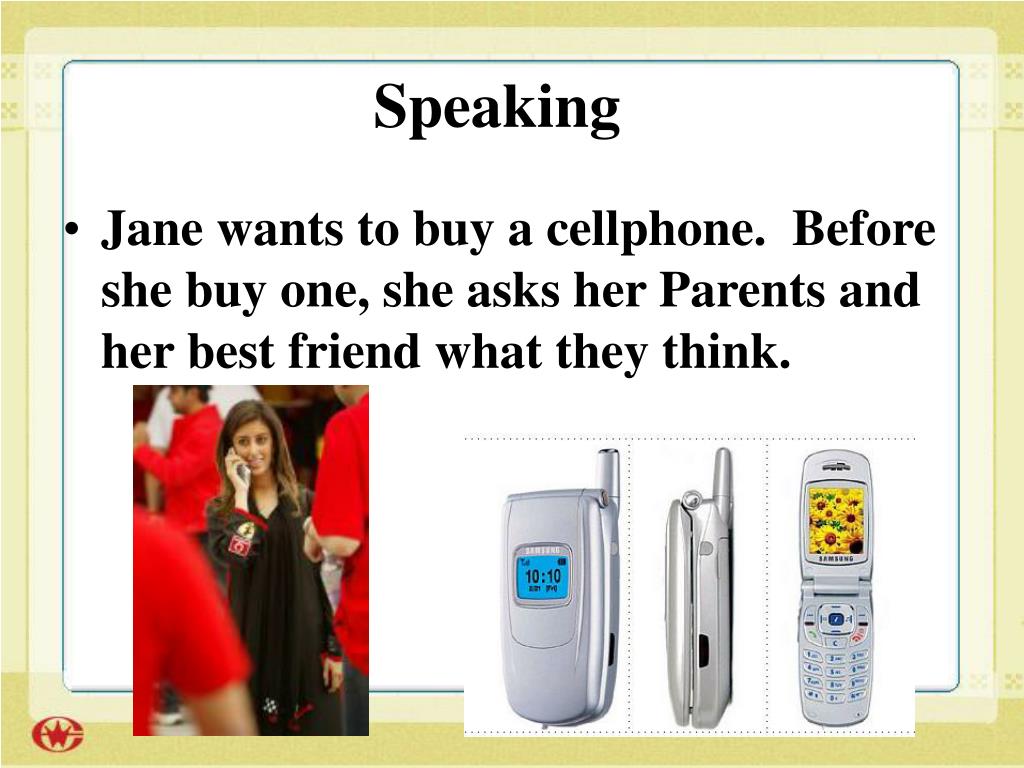 Speaking • Jane wants to buy a cellphone. Before she buy one, she asks her Parents and her best friend what they think.
