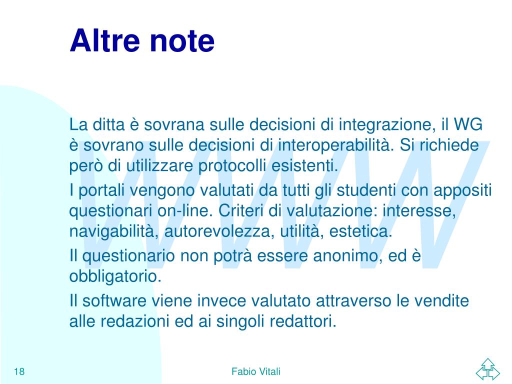 Altre note • La ditta è sovrana sulle decisioni di integrazione, il WG è sovrano sulle decisioni di interoperabilità. Si richiede però di utilizzare protocolli esistenti. • I portali vengono valutati da tutti gli studenti con appositi questionari on-line. Criteri di valutazione: interesse, navigabilità, autorevolezza, utilità, estetica. • Il questionario non potrà essere anonimo, ed è obbligatorio. • Il software viene invece valutato attraverso le vendite alle redazioni ed ai singoli redattori. Fabio Vitali