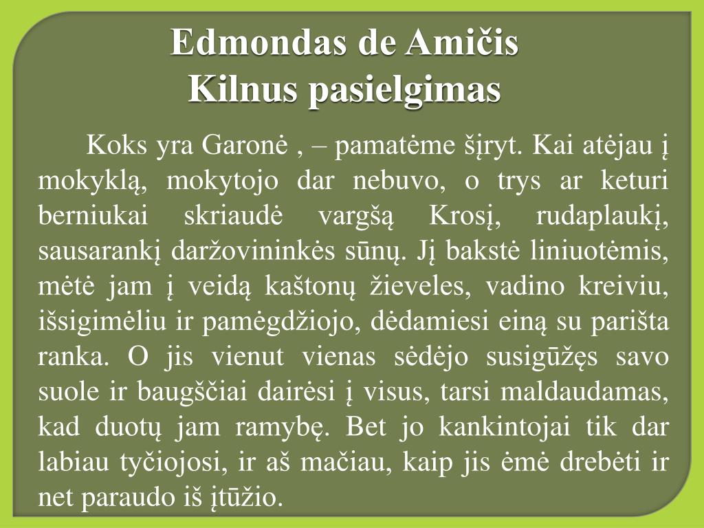 Edmondas de AmičisKilnus pasielgimas • Koks yra Garonė , – pamatėme šįryt. Kai atėjau į mokyklą, mokytojo dar nebuvo, o trys ar keturi berniukai skriaudė vargšą Krosį, rudaplaukį, sausarankį daržovininkės sūnų. Jį bakstė liniuotėmis, mėtė jam į veidą kaštonų žieveles, vadino kreiviu, išsigimėliu ir pamėgdžiojo, dėdamiesi einą su parišta ranka. O jis vienut vienas sėdėjo susigūžęs savo suole ir baugščiai dairėsi į visus, tarsi maldaudamas, kad duotų jam ramybę. Bet jo kankintojai tik dar labiau tyčiojosi, ir aš mačiau, kaip jis ėmė drebėti ir net paraudo iš įtūžio.