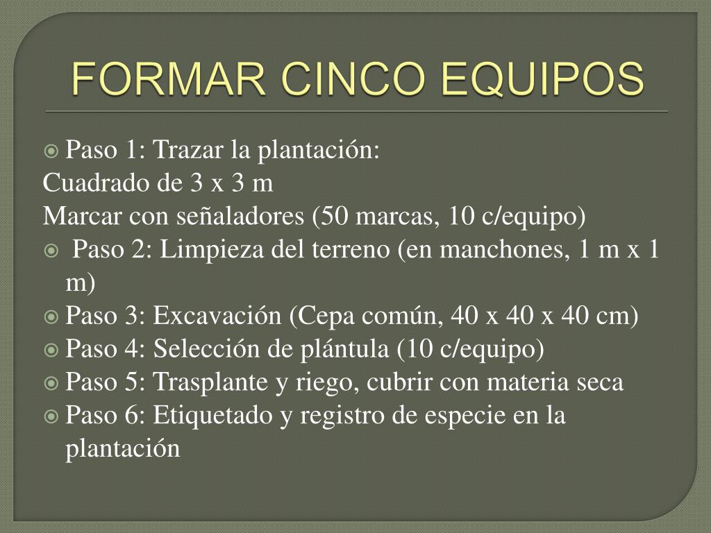 FORMAR CINCO EQUIPOS Paso 1: Trazar la plantación: Cuadrado de 3 x 3 m Marcar con señaladores (50 marcas, 10 c/equipo) Paso 2: Limpieza del terreno (en manchones, 1 m x 1 m) Paso 3: Excavación (Cepa común, 40 x 40 x 40 cm) Paso 4: Selección de plántula (10 c/equipo) Paso 5: Trasplante y riego, cubrir con materia seca Paso 6: Etiquetado y registro de especie en la plantación