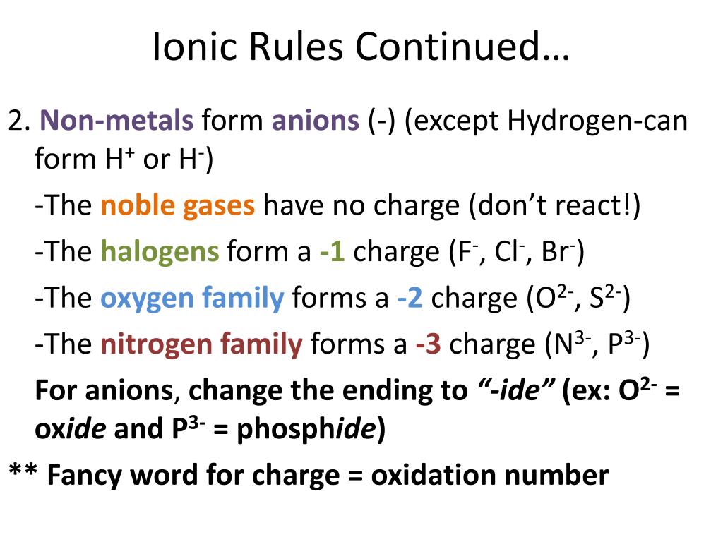 Ionic Rules Continued… 2. Non-metals form anions (-) (except Hydrogen-can form H+ or H-) -The noble gases have no charge (don’t react!) -The halogens form a -1 charge (F-, Cl-, Br-) -The oxygen family forms a -2 charge (O2-, S2-) -The nitrogen family forms a -3 charge (N3-, P3-) For anions, change the ending to “-ide” (ex: O2- = oxide and P3- = phosphide) ** Fancy word for charge = oxidation number