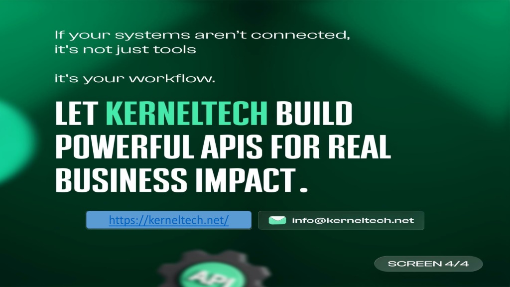 Disconnected systems slow your business down.nWhen tools donu2019t work together, data gets scattered, and your team loses time on things that should be simple.nAt Kernel Tech, we build APIs that connect everything u2014 so your systems work smoothly, processes become faster, and your workflow stays in control.nnIf your business relies on multiple tools, itu2019s time to bring everything together the right way.nnLetu2019s build something that actually works for your business