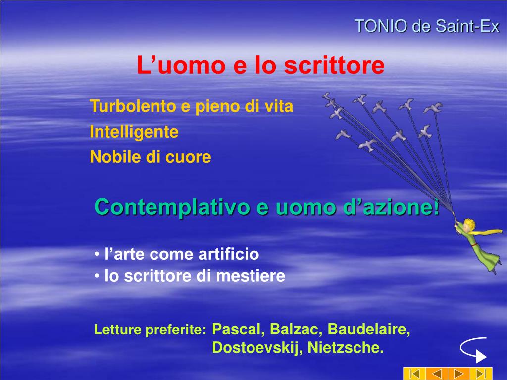 TONIO de Saint-Ex L’uomo e lo scrittore Turbolento e pieno di vita Intelligente Nobile di cuore Contemplativo e uomo d’azione! • l’arte come artificio • lo scrittore di mestiere Letture preferite: Pascal, Balzac, Baudelaire, Dostoevskij, Nietzsche.
