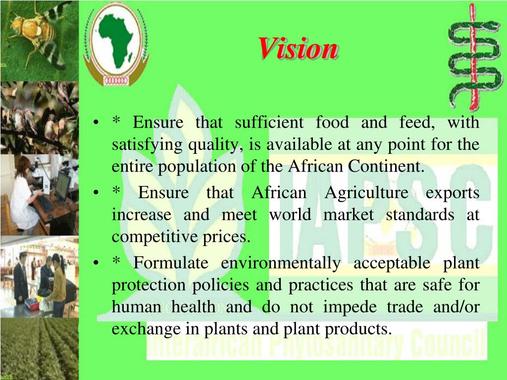 Vision • * Ensure that sufficient food and feed, with satisfying quality, is available at any point for the entire population of the African Continent. • * Ensure that African Agriculture exports increase and meet world market standards at competitive prices. • * Formulate environmentally acceptable plant protection policies and practices that are safe for human health and do not impede trade and/or exchange in plants and plant products.