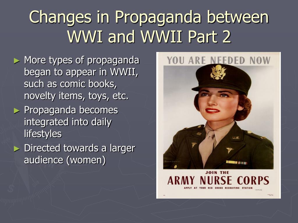 Changes in Propaganda between WWI and WWII Part 2 • More types of propaganda began to appear in WWII, such as comic books, novelty items, toys, etc. • Propaganda becomes integrated into daily lifestyles • Directed towards a larger audience (women)