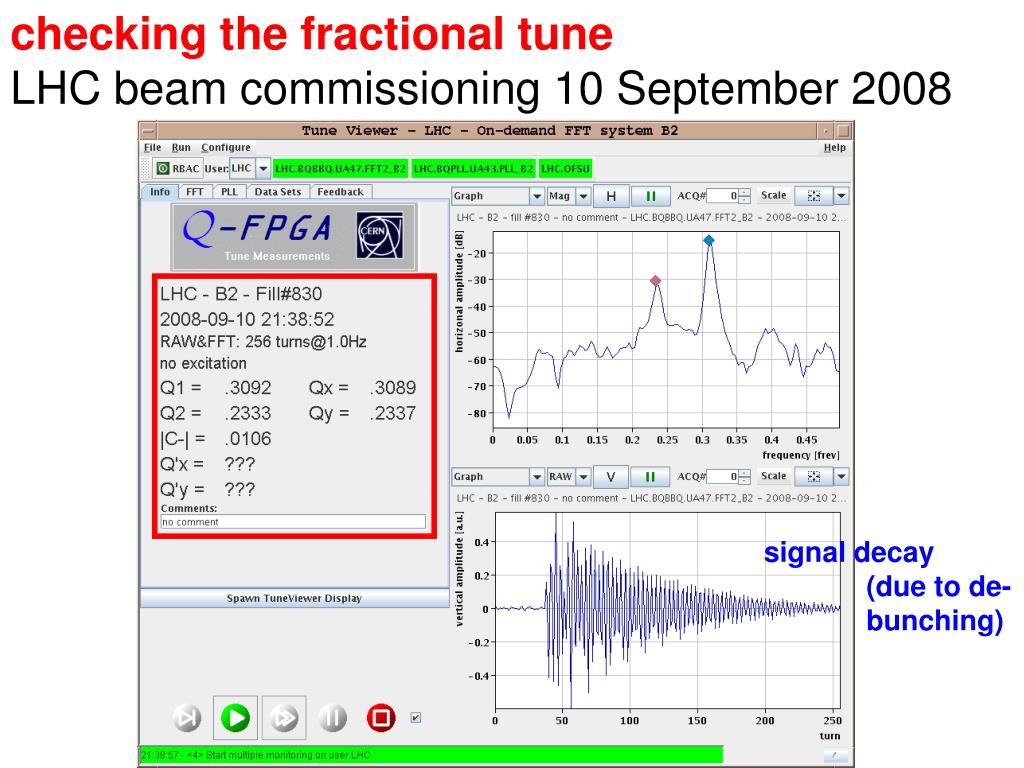 checking the fractional tune LHC beam commissioning 10 September 2008 signal decay (due to de- bunching)