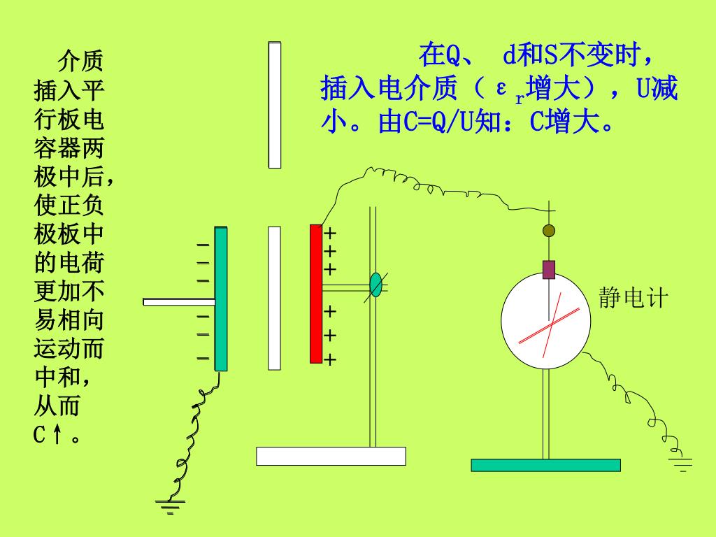 + + + 静电计 + + + 在Q、 d和S不变时,插入电介质(εr增大),U减小。由C=Q/U知:C增大。 介质插入平行板电容器两极中后,使正负极板中的电荷更加不易相向运动而中和,从而C↑。