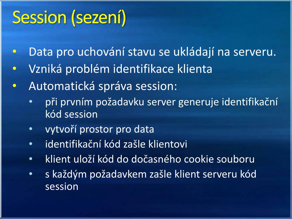 Session (sezení) • Data pro uchování stavu se ukládají na serveru. • Vzniká problém identifikace klienta • Automatická správa session: • při prvním požadavku server generuje identifikační kód session • vytvoří prostor pro data • identifikační kód zašle klientovi • klient uloží kód do dočasného cookie souboru • s každým požadavkem zašle klient serveru kód session