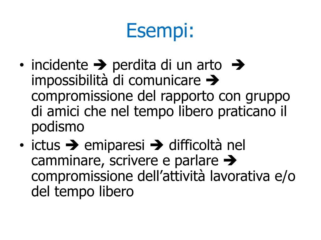 Esempi: • incidente perdita di un arto impossibilità di comunicare compromissione del rapporto con gruppo di amici che nel tempo libero praticano il podismo • ictus emiparesi difficoltà nel camminare, scrivere e parlare compromissione dell’attività lavorativa e/o del tempo libero