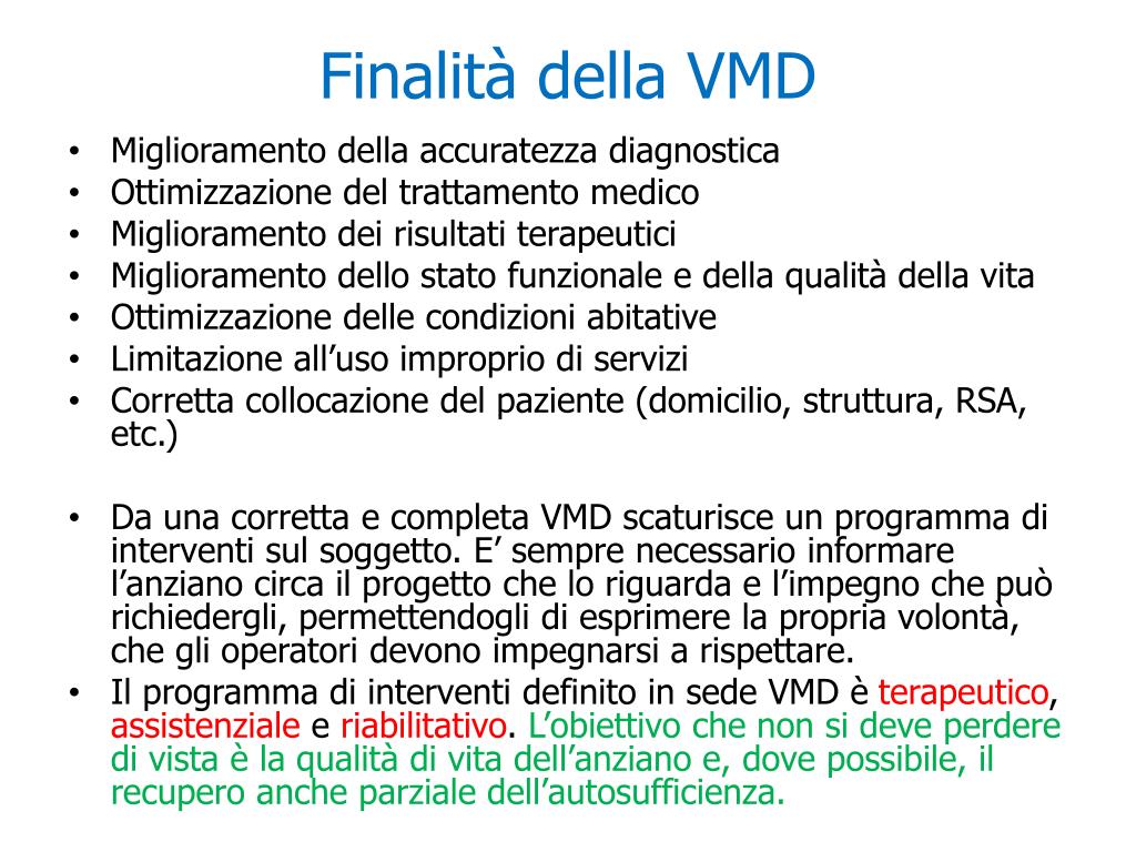 Finalità della VMD • Miglioramento della accuratezza diagnostica • Ottimizzazione del trattamento medico • Miglioramento dei risultati terapeutici • Miglioramento dello stato funzionale e della qualità della vita • Ottimizzazione delle condizioni abitative • Limitazione all’uso improprio di servizi • Corretta collocazione del paziente (domicilio, struttura, RSA, etc.) • Da una corretta e completa VMD scaturisce un programma di interventi sul soggetto. E’ sempre necessario informare l’anziano circa il progetto che lo riguarda e l’impegno che può richiedergli, permettendogli di esprimere la propria volontà, che gli operatori devono impegnarsi a rispettare. • Il programma di interventi definito in sede VMD è terapeutico, assistenziale e riabilitativo. L’obiettivo che non si deve perdere di vista è la qualità di vita dell’anziano e, dove possibile, il recupero anche parziale dell’autosufficienza.