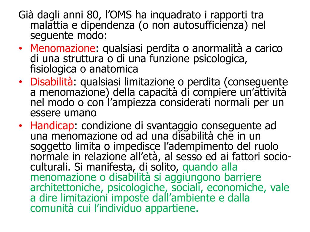 Già dagli anni 80, l’OMS ha inquadrato i rapporti tra malattia e dipendenza (o non autosufficienza) nel seguente modo: • Menomazione: qualsiasi perdita o anormalità a carico di una struttura o di una funzione psicologica, fisiologica o anatomica • Disabilità: qualsiasi limitazione o perdita (conseguente a menomazione) della capacità di compiere un’attività nel modo o con l’ampiezza considerati normali per un essere umano • Handicap: condizione di svantaggio conseguente ad una menomazione od ad una disabilità che in un soggetto limita o impedisce l’adempimento del ruolo normale in relazione all’età, al sesso ed ai fattori socio-culturali. Si manifesta, di solito, quando alla menomazione o disabilità si aggiungono barriere architettoniche, psicologiche, sociali, economiche, vale a dire limitazioni imposte dall’ambiente e dalla comunità cui l’individuo appartiene.
