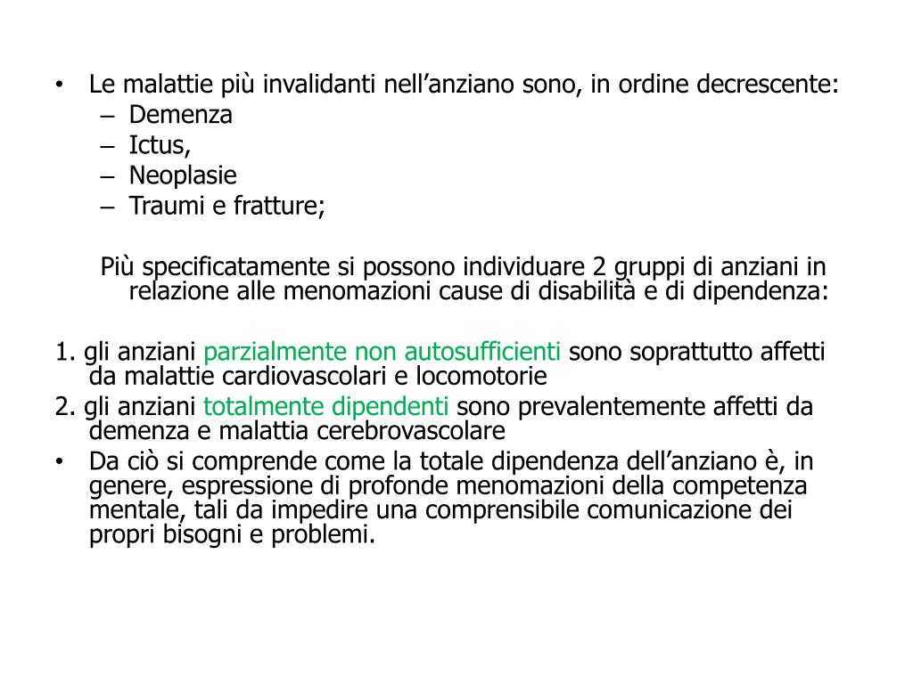 Le malattie più invalidanti nell’anziano sono, in ordine decrescente: • Demenza • Ictus, • Neoplasie • Traumi e fratture; Più specificatamente si possono individuare 2 gruppi di anziani in relazione alle menomazioni cause di disabilità e di dipendenza: 1. gli anziani parzialmente non autosufficienti sono soprattutto affetti da malattie cardiovascolari e locomotorie 2. gli anziani totalmente dipendenti sono prevalentemente affetti da demenza e malattia cerebrovascolare • Da ciò si comprende come la totale dipendenza dell’anziano è, in genere, espressione di profonde menomazioni della competenza mentale, tali da impedire una comprensibile comunicazione dei propri bisogni e problemi.