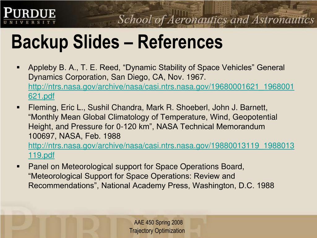 Backup Slides – References • Appleby B. A., T. E. Reed, “Dynamic Stability of Space Vehicles” General Dynamics Corporation, San Diego, CA, Nov. 1967. http://ntrs.nasa.gov/archive/nasa/casi.ntrs.nasa.gov/19680001621_1968001621.pdf • Fleming, Eric L., Sushil Chandra, Mark R. Shoeberl, John J. Barnett, “Monthly Mean Global Climatology of Temperature, Wind, Geopotential Height, and Pressure for 0-120 km”, NASA Technical Memorandum 100697, NASA, Feb. 1988 http://ntrs.nasa.gov/archive/nasa/casi.ntrs.nasa.gov/19880013119_1988013119.pdf • Panel on Meteorological support for Space Operations Board, “Meteorological Support for Space Operations: Review and Recommendations”, National Academy Press, Washington, D.C. 1988 AAE 450 Spring 2008 Trajectory Optimization