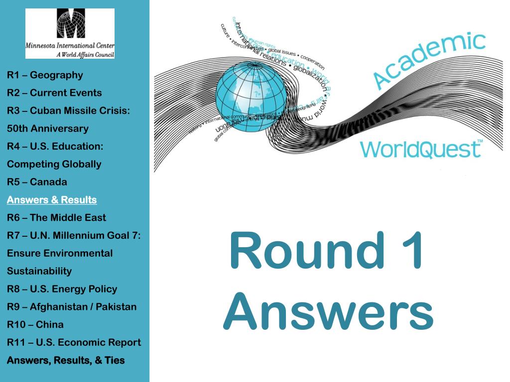 R1 – Geography R2 – Current Events R3 – Cuban Missile Crisis: 50th Anniversary R4 – U.S. Education: Competing Globally R5 – Canada Answers & Results R6 – The Middle East R7 – U.N. Millennium Goal 7: Ensure Environmental Sustainability R8 – U.S. Energy Policy R9 – Afghanistan / Pakistan R10 – China R11 – U.S. Economic Report Answers, Results, & Ties Round 1 Answers
