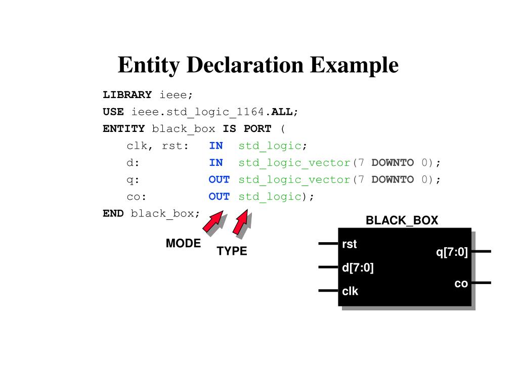 BLACK_BOX MODE rst TYPE q[7:0] d[7:0] co clk Entity Declaration Example LIBRARY ieee; USE ieee.std_logic_1164.ALL; ENTITY black_box IS PORT ( clk, rst: INstd_logic; d: INstd_logic_vector(7 DOWNTO 0); q: OUTstd_logic_vector(7 DOWNTO 0); co: OUTstd_logic); END black_box;