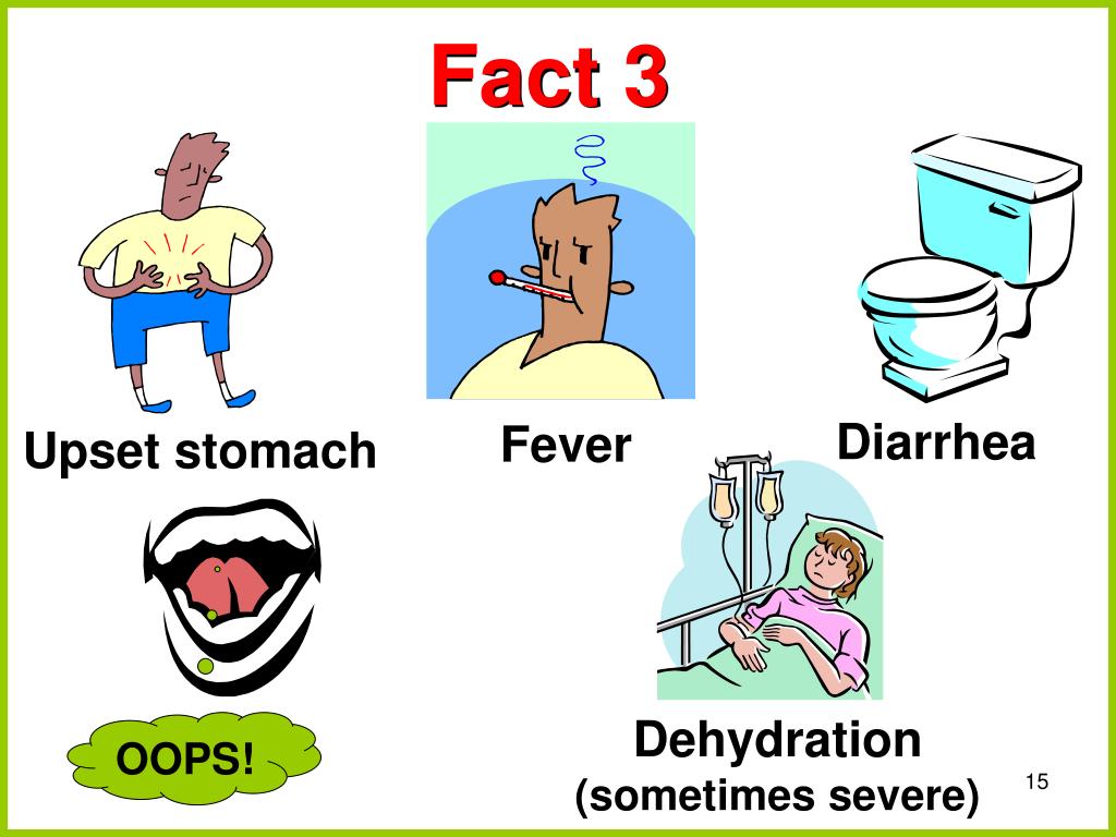 Upset stomach OOPS! Dehydration(sometimes severe) Fact 3 Diarrhea Fever