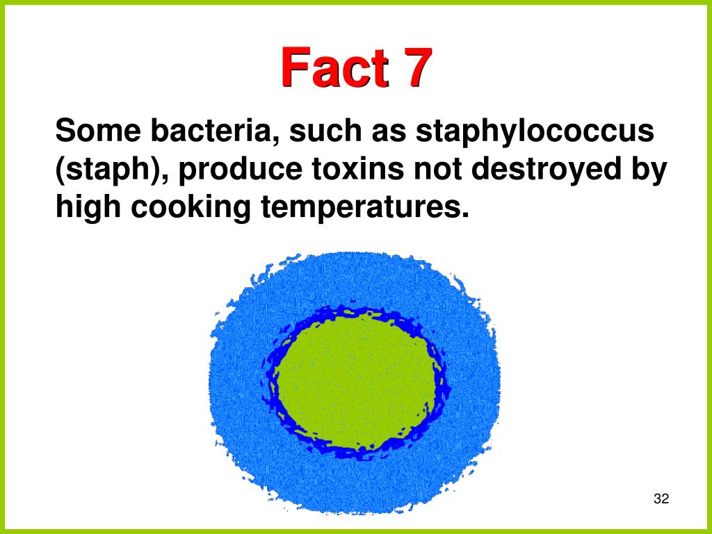 Fact 7 Some bacteria, such as staphylococcus (staph), produce toxins not destroyed by high cooking temperatures.