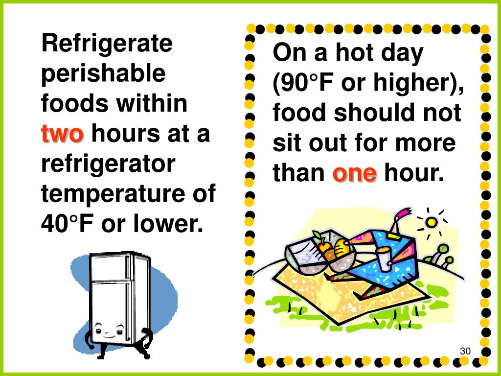 Refrigerateperishable foods within two hours at a refrigerator temperature of 40°F or lower. On a hot day (90°F or higher), food should not sit out for more than one hour.