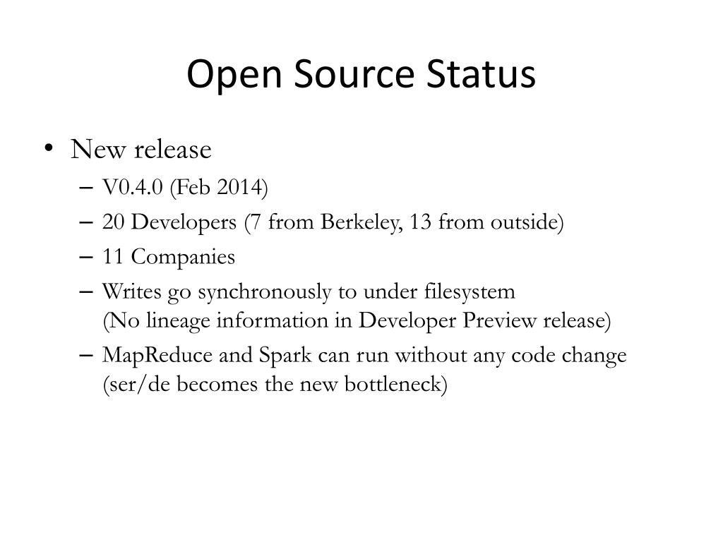 Open Source Status • New release • V0.4.0 (Feb 2014) • 20 Developers (7 from Berkeley, 13 from outside) • 11 Companies • Writes go synchronously to under filesystem(No lineage information in Developer Preview release) • MapReduce and Spark can run without any code change (ser/de becomes the new bottleneck)
